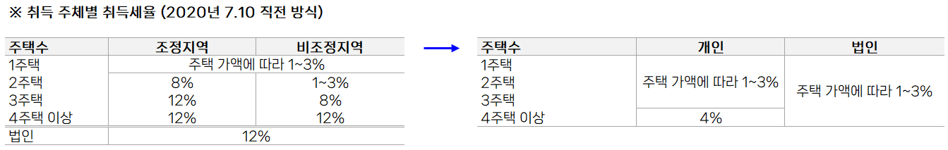 : 개인은 3주택까지 주택 가액에 따라 1~3%, 4주택 이상은 4%,